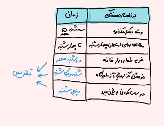 یک لیست از همهی کارهایی که توی هفتهی پیش رو باید انجام بشن یا تو دلت میخواد انجام بدی رو بنویس. از کارهای مهم گرفته تا کارهای کوچیک و روزمره همه رو توی این لیست بیار. طبیعتا شکل لیست و اینکه چه طرحی بکشی به خودت ربط داره. صرفا باید طرحی باشه که بشه همچین لیستی رو توش نوشت.