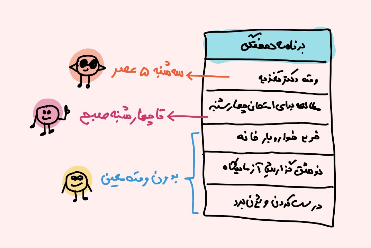 در لیست وظایف هفتگیت، زمان دقیق کارهای دسته ی اول رو مشخص کن. مثلا باید معلوم باشه که چهارشنبه ساعت ۵ عصر باید به دکتر بری. بعدش برو سراغ کارهای مهلت دار و مهلت اونها رو هم بنویس تا حواست باشه که چه زمانی باید تموم بشن. حالا نوبت به کارهای بی زمان می رسه. توی لیستت یک «زمان پیشنهادی» براشون در نظر بگیر. هدفمون اینه که بتونیم یک تصویر کلی از حجم کارهای هفته داشته باشیم و روزهامون رو متعادل بچینیم.