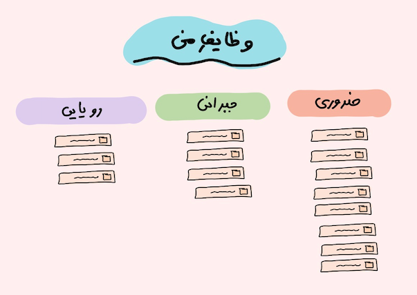 وظایف ما احتمالا مربوط به یکی از این سه دسته میشن: کارهای ضروری، جبرانی و رویایی. یک لیست وظایف متعادل باید از هر سه دسته در خودش داشته باشه.