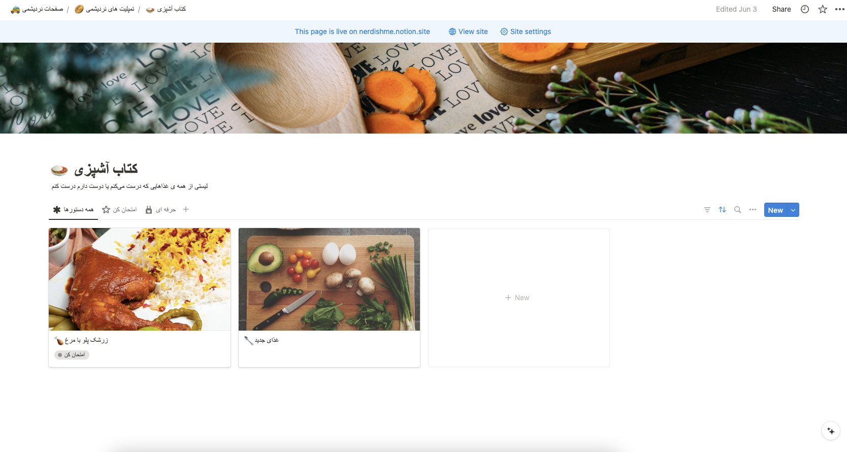 هیچ کس یک شبه آشپز نمیشه. بلکه برای مهارت پیدا کردن در آشپزی باید مدام غذاهای جدید رو امتحان کنیم و غذاهایی که قبلا درست کردیم رو دوباره بپزیم تا توشون بهتر بشیم. این تمپلیت کمکت میکنه یک لیست از همه ی غذاهایی که تا حالا درست کردی یا میخوای درست کنی داشته باشی.