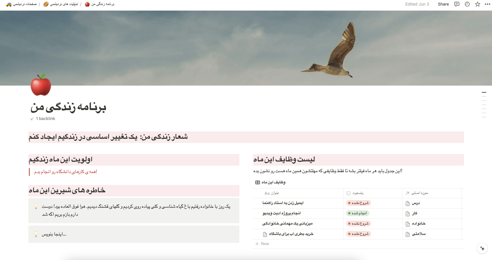 این تمپلیت قراره تبدیل شه به صفحه ی اصلی زندگی تو که جنبه های مختلف زندگیت رو در برمیگیره. فارغ از اینکه تو چه اهداف و برنامه هایی داری، میتونی این صفحه رو پر کنی و برای اهدافت برنامه بریزی.