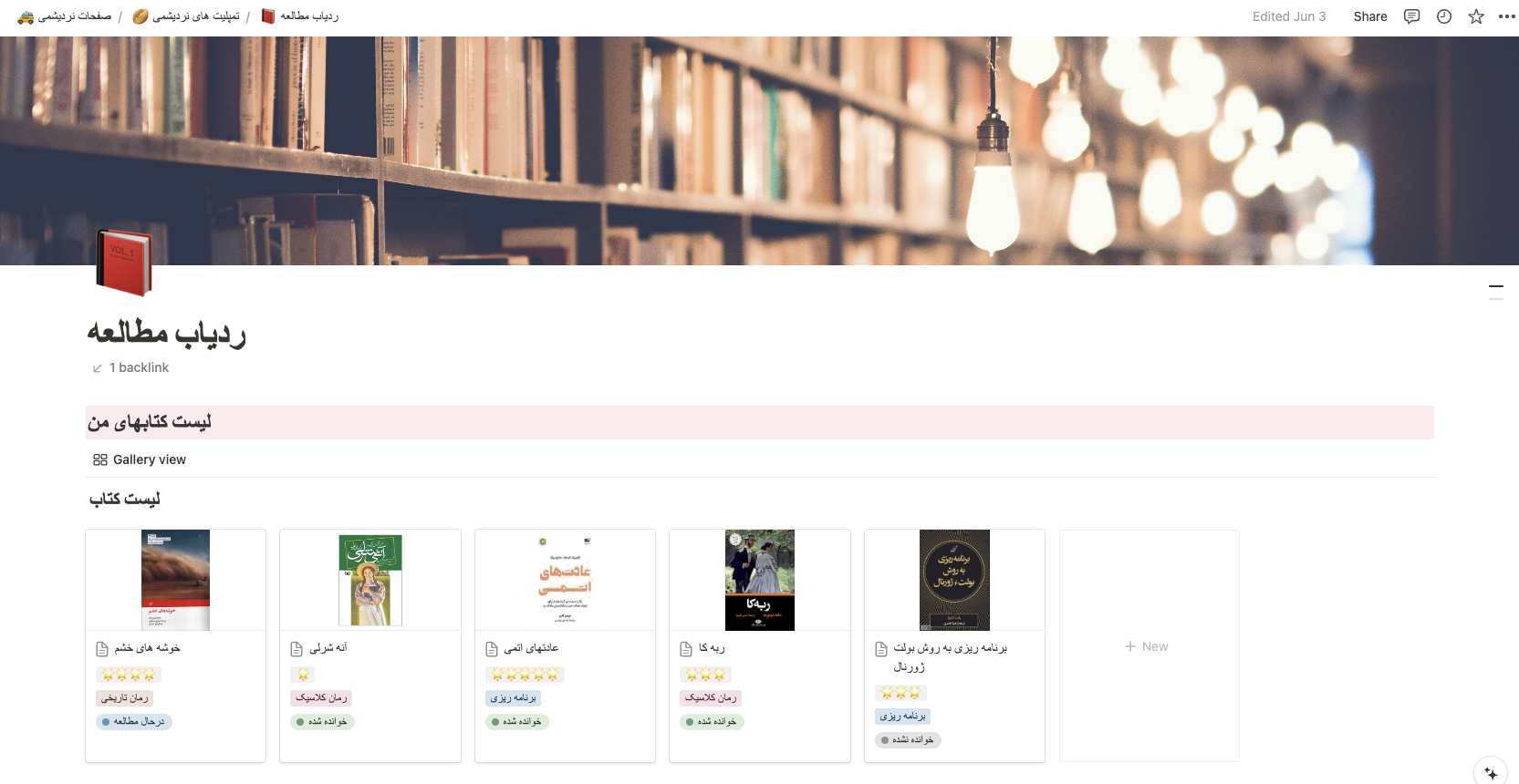 اگر تو هم یک کتابخون هستی، پس حتما نیاز داری لیست کتابهایی که میخوای بخونی یا خوندی رو یک جا ذخیره کنی و نظرت رو دربارش بنویسی و حتی یک خلاصه ی کوچولو از اون کتاب نگه داری. خب این تمپلیت همه ی این امکانات رو داره.