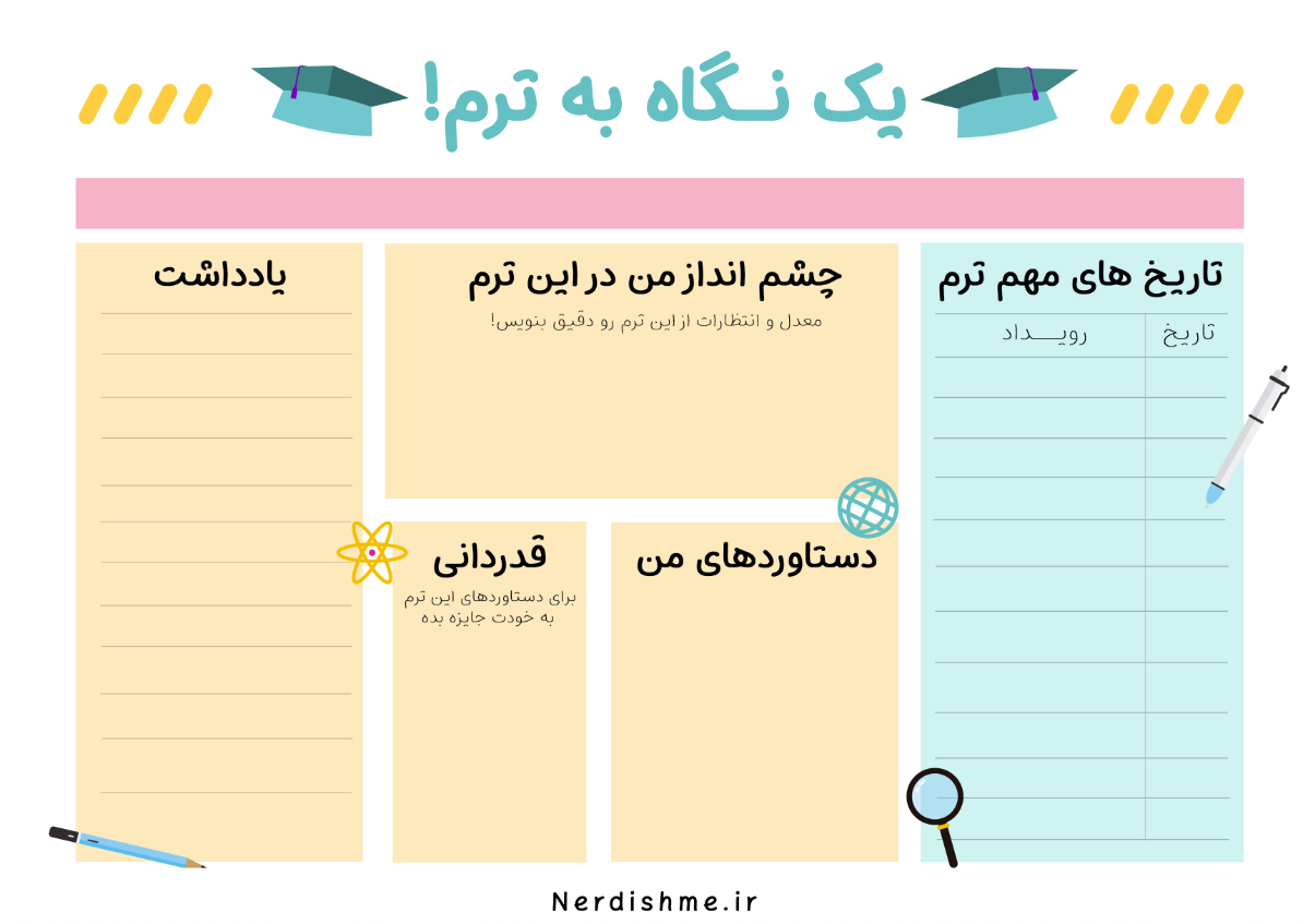 این ترم چه درسهایی داری، تاریخ پایانترم ها و میانترم هاشون مشخصه؟ ایمیل استادها رو داری؟ برای آخر ترم به خودت چه جایزه ای میدی؟ همه ی اینها و بقیه ی اطلاعات مهم مربوط به ترم جدید رو در این صفحه یادداشت کن.
