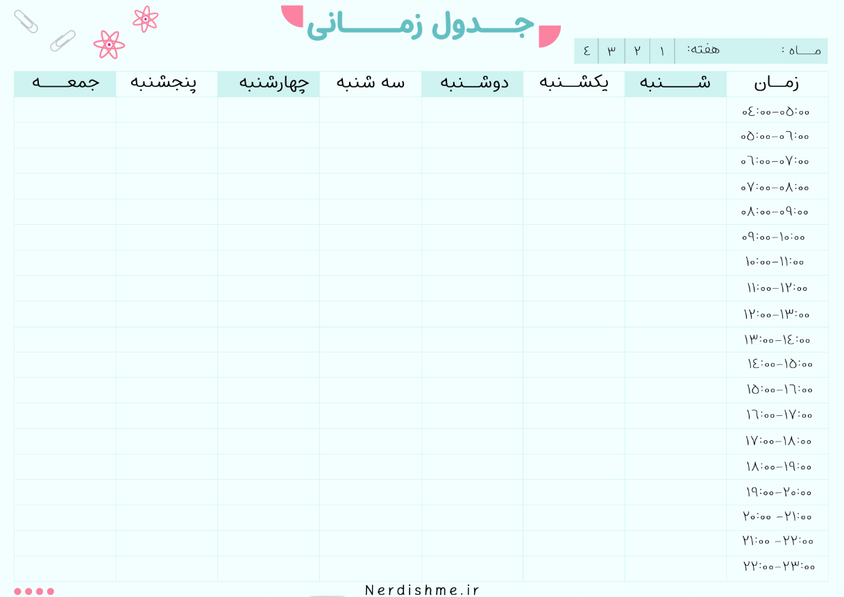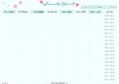 اگه نیاز داری برنامه ی ساعتی دقیق داشته باشی، این صفحه به دردت میخوره. میتونی توش برای کل هفته برنامه ریزی کنی که از هر ساعت تا هر ساعتی چه کار باید انجام بدی و چی باید بخونی.