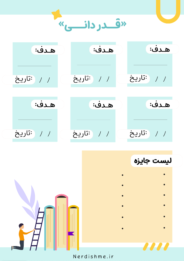 درس خوندن و موفق شدن در محیط آکادمیک سخته. بعضی وقتا باید همزمان هزارتا کار بکنی: برای امتحان آماده شی، پروژه ت رو پیش ببری، فعالیت فوق برنامه انجام بدی و شاید توی یک مسابقه هم شرکت کنی. خوبه که هدف های مختلفت رو بنویسی و تاریخ رسیدن بهشون رو ثبت کنی و بابت هر دستاورد از خودت قدردانی کنی. راستی جایزه ی مورد علاقه ت چی؟!