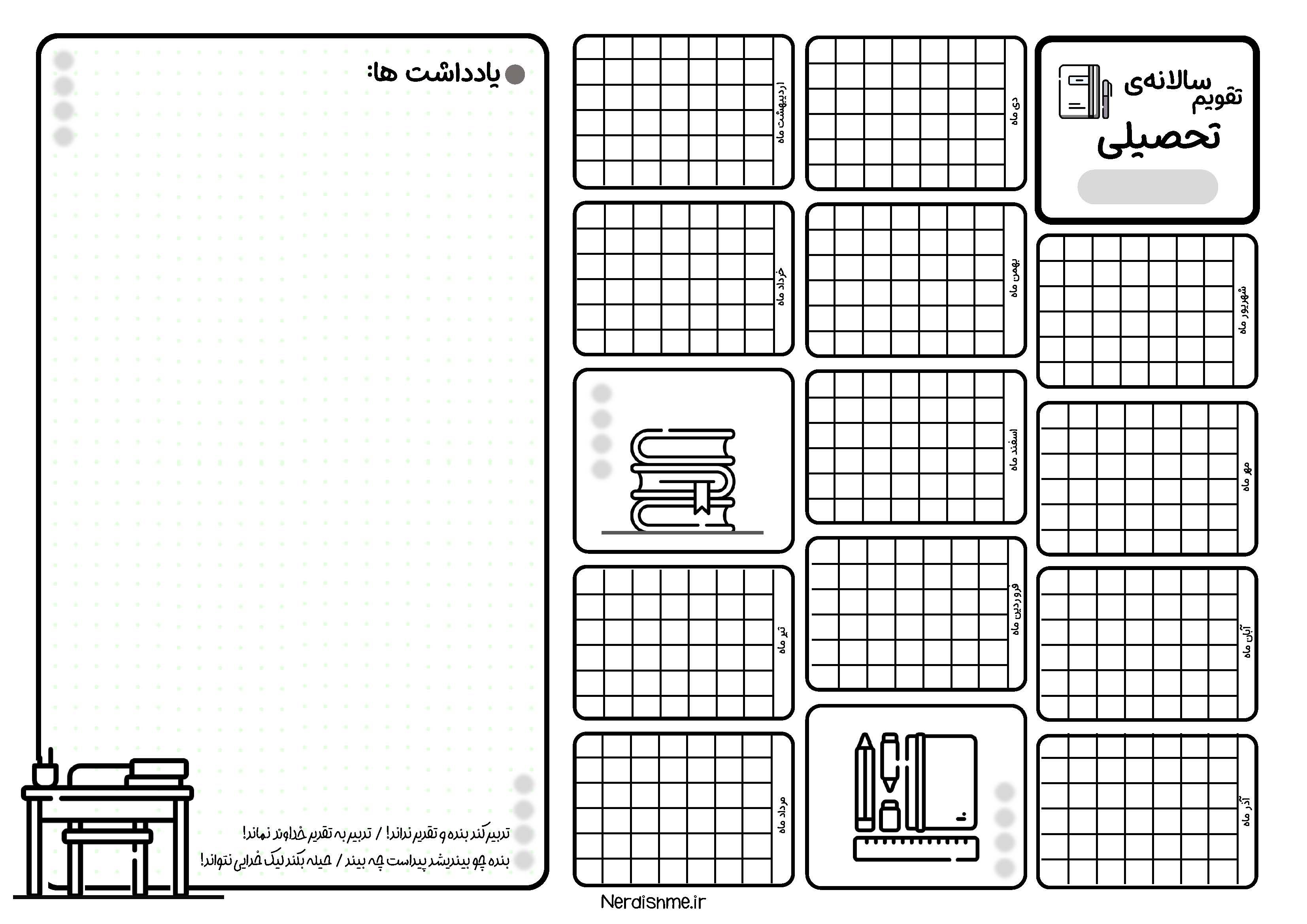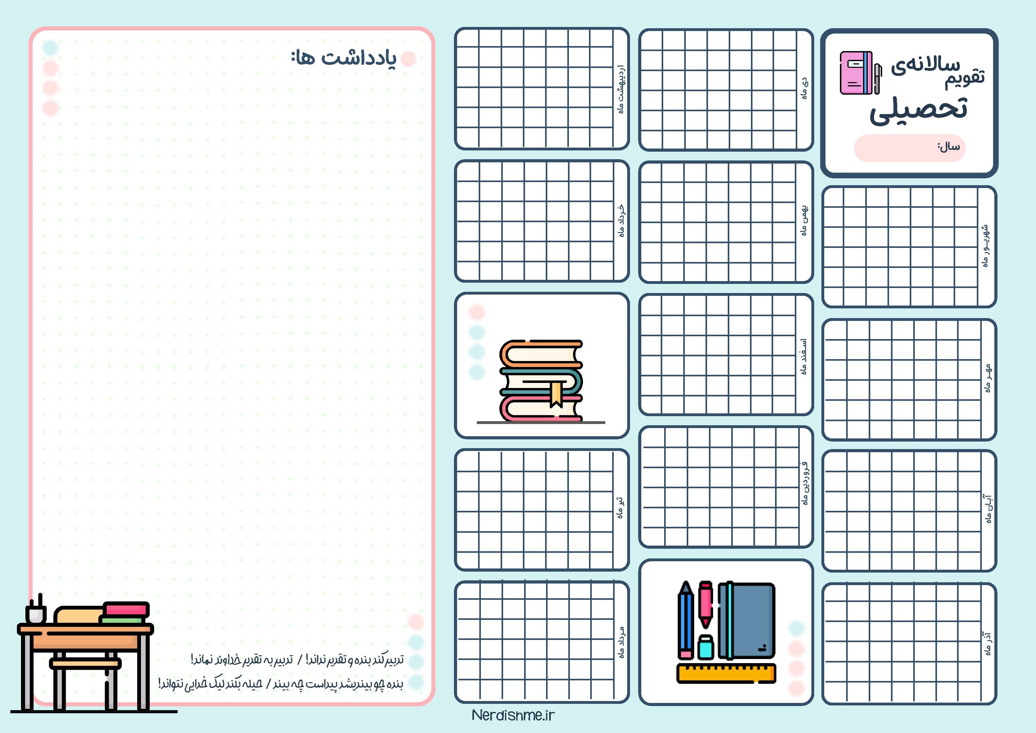 اگر به دنبال دانلود رایگان تقویم تحصیلی هستی، اینجا جای درستی اومدی. ما یک تقویم سالانه تحصیلی آماده کردهایم که هم نسخه رنگی دارد و هم سیاه و سفید. این تقویمها کاملاً قابل چاپ هستند و به راحتی میتوانید برنامهریزی تحصیلی خودتان را انجام دهید.