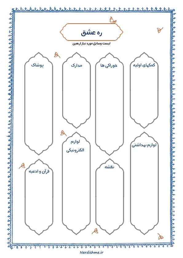 پیادهروی اربعین یکی از بزرگترین تجمعات مذهبی جهانه و نیاز به آمادگی روحی و جسمی خاصی داره. این چاپکی به شما کمک میکنه تا همه چیزهای لازم برای این سفر رو آماده کنید و چیزی رو فراموش نکنید. میتونی وسایل شخصی مورد نیاز، مدارک لازم، مواد غذایی، وسایل بهداشتی و سایر لوازم ضروری رو از قبل سفر اینجا بنویسی و لیست نهایی رو هم با خودت ببری.